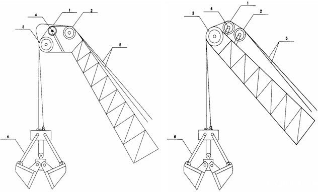 1、称重滑轮2、过桥滑轮3、吊臂滑轮4、测力传感器5、提升、开闭绳6、无功抓斗